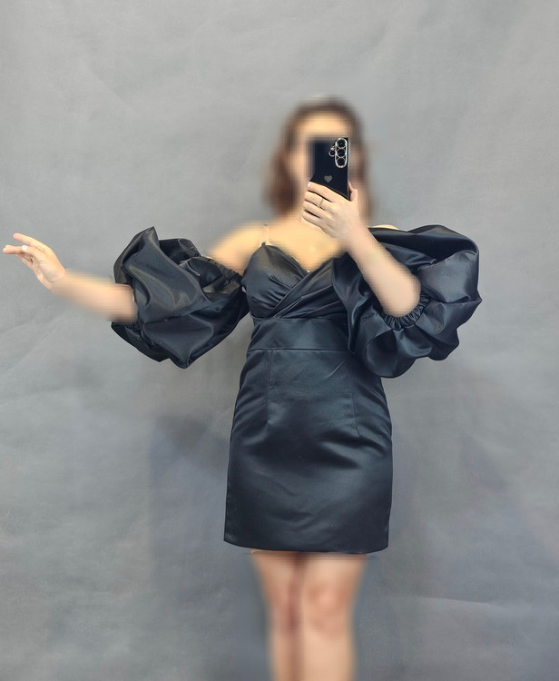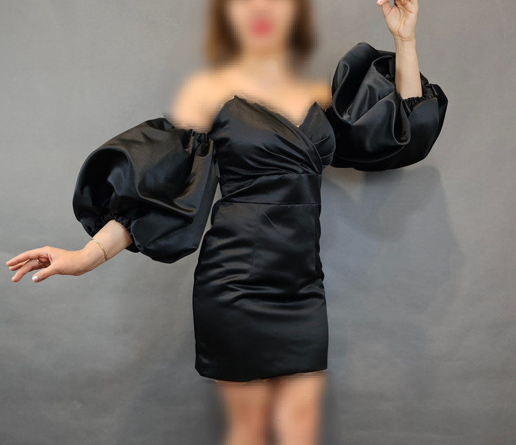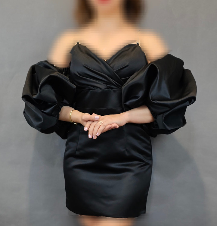 لباس مجلسی کوتاه ساتن زنانه آستین پفی یقه کرستی