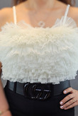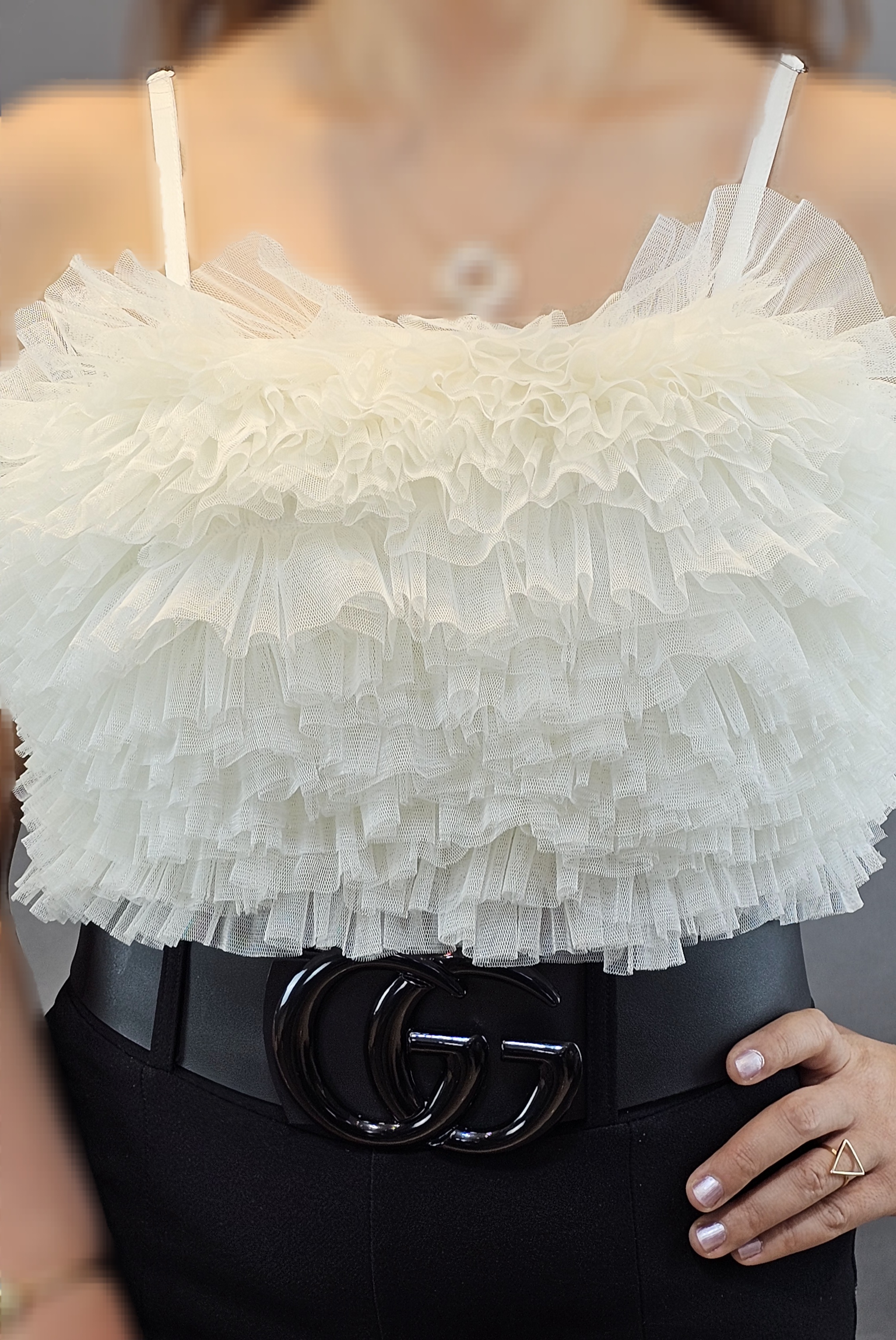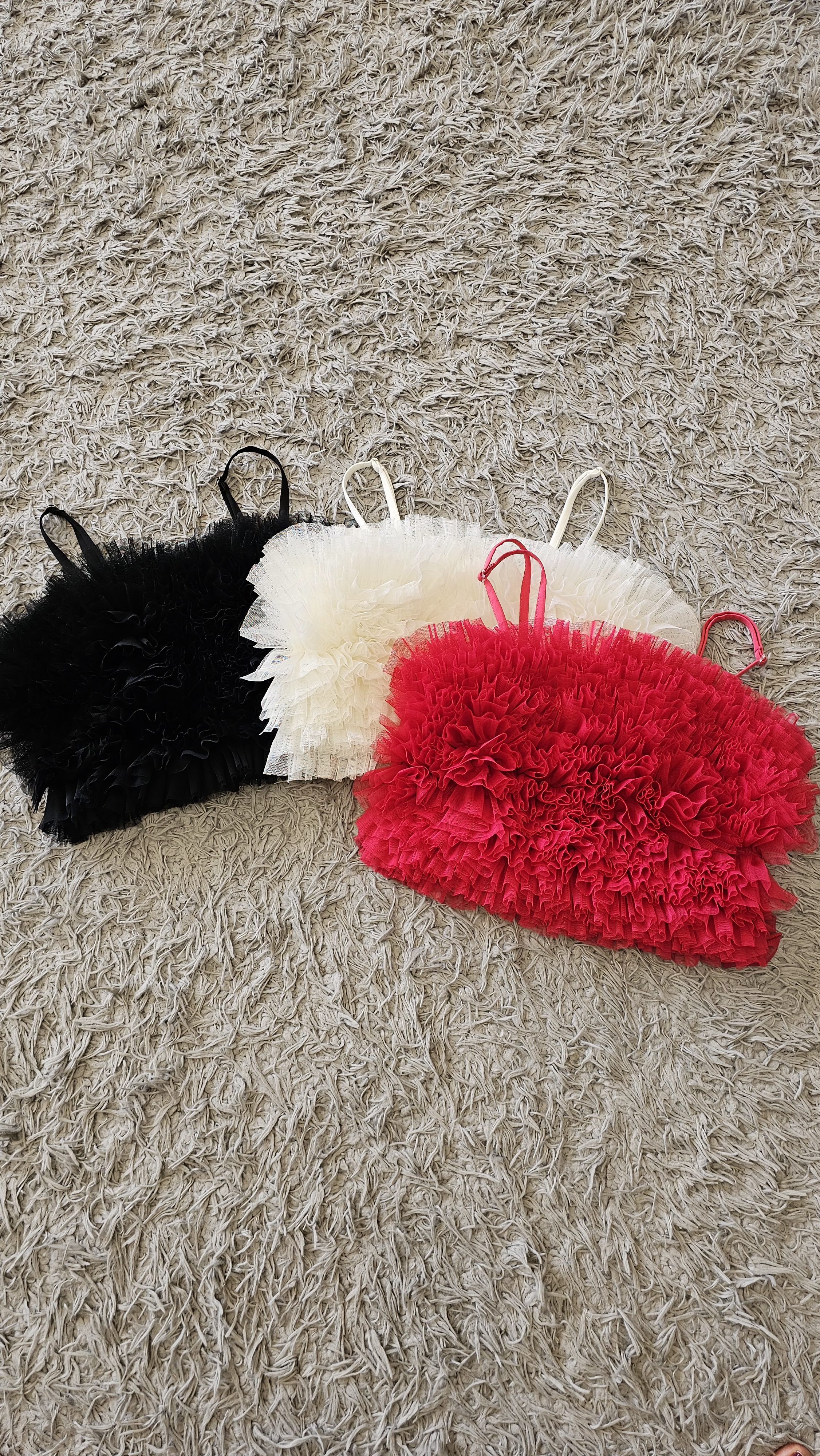 جنس تاپ کرپ می باشد و جلوی تاپ پارچه ی تور به کار رفته است.